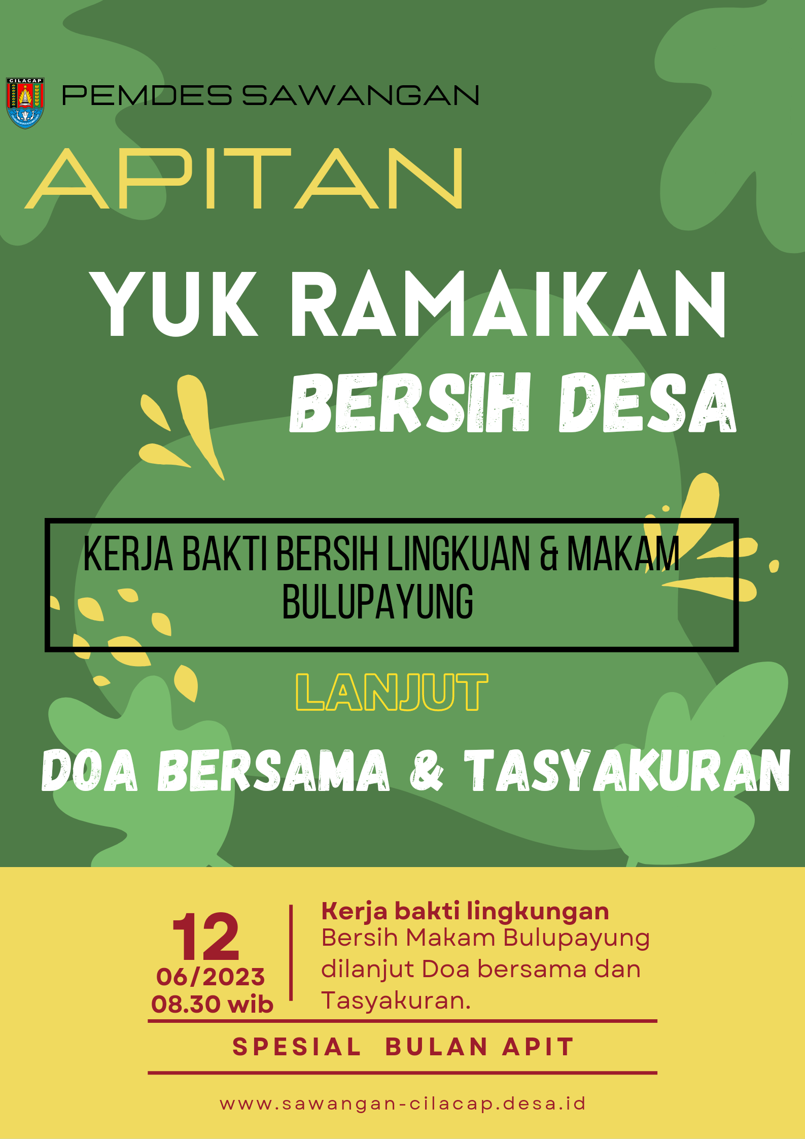 Untuk itu, kami mengharapkan kehadiran seluruh warga desa pada kegiatan Apitan Bersih Desa dan doa bersama dan tasyakuran. Mari kita bersama-sama menjaga kebersihan lingkungan desa dan mempererat tali silaturahmi antar warga.